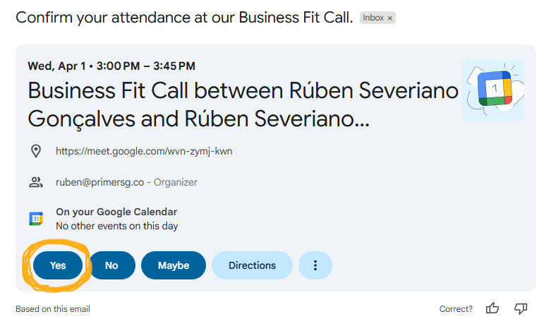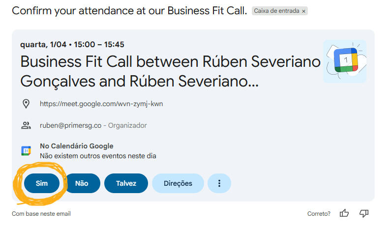 Confirma a tua chamada selecionando "Sim" no convite de calendário do email.